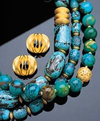 Large wave ball earrings of 18K yellow gold, 20 mm; a 17-inch necklace of 16 x 27 mm oblong turquoise beads with 18K yellow gold clasp and spacers; a 16-inch long necklace of 11 mm x 12.5 mm oblong turquoise beads with 18K yellow gold clasp and spacers; a 17-inch necklace of 18.5mm natural Chinese turquoise beads with 18K yellow gold half-round spacers and Milky Way changeable clasp with 12 diamonds, 0.12 ct tw. |