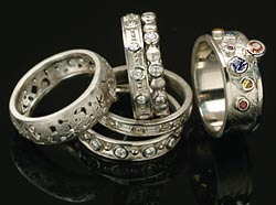 | Platinum rings with diamonds and multi-colored sapphires, in various patterns. The ring to the far left is one of Heinrich's signature designs, her Milky Way pattern with moons and stars. |