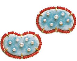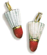 | Birdies (ear decoration), 1994 enamel, coral. 18kt gold. 1 x 1/2 x 3/8″ Photo: Roger Birn |