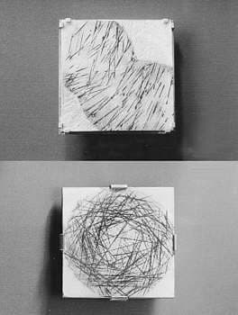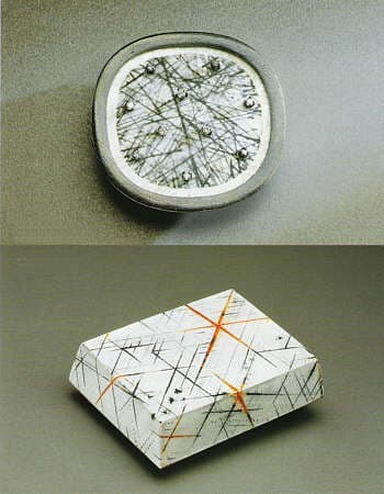 It's a reminder of how much can be communicated with line only. Nonetheless, the addition of color, when it does arrive, comes as a welcome intruder. Like a prism the light has broken up into its component colors, with shards thrown off in various directions. All in all, Seidenath's judicious use of color shows remarkable restraint. Too often, enamelists are seduced by brilliant color and sparkly transparency, set off by garish gold cloisonne wires or bezeling. But Seidenath shows her allegiance to form and design be concentrating on a few complementary colors and in the simplicity of black and white. In her early work, she threw a cloak of vivid color on and into her fully dimensional constructions. Then, in the winter series, she has withheld the easy allure of colored glass and dealt with linear suggestion of movement and stasis, in a contained format.