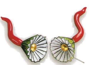 | Wurzelblute (ear decoration), 1991 enamel, coral, 18k gold 2 1/4 x 5/8 x 5/8″ Photo: lochs Grun |