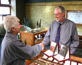 Having learned his craft from an ex-Marine Corps guy, he says, you're conditioned to improvise to get the job done. And a fine job it is, as evident in the repair, setting and finishing work he does for the store. The ultimate compliment comes from Barney, who has dubbed him 'Merlin' for the seemingly magical work he performs on jewelry.