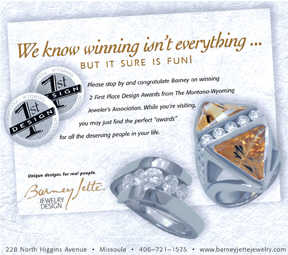 Soft-spoken and unassuming, Barney is the big name behind the business. He design and creates the models for all of the jewelry at Barney Jette Jewelry Design in Missoula , Montana . Locally, it has become a status symbol to own "a Barney " and his work is readily identifiable. Customers understand the value of his pieces in uniqueness, quality and artistry.
