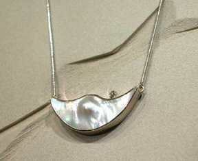 Creatively displayed in a wall showcase is this American Freshwater Pearl shell product that Jette cut and shaped. Smith fabricated the pendant and set the pearl and diamond and finished the piece.