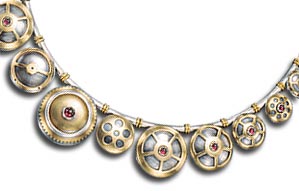 | Necklace fabricated from sterling silver and brass gears with garnets; 1″ x 16″. Photo: Ralph Gabriner. |