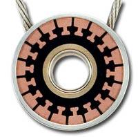 | Commutator necklace: sterling silver, cross section of commutator (alternates current in a motor); fabricated; 1″ x 1″ x 1/2″. |