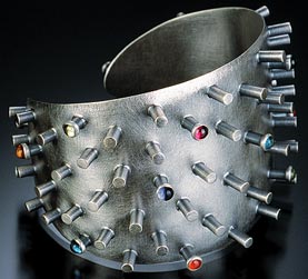 | Cuff bracelet fabricated in sterling silver with a filed texture and stones. 2″ x 6″. Photo: Robert Diamante. |
