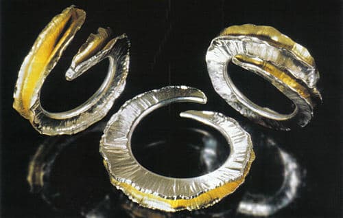 When I no longer had daycare bills to pay, I felt as if I had received a grant and could take more chances with my work. I now had more time to create art jewelry. In 1990 my wonderful, generous mother-in-law inadvertently helped me start on a new thread when she commissioned a pin for her future daughter-in-law and instructed me to make something for myself, too. Well! Now I could justify making that time-consuming Celtic-style torque Fred Fenster had shown us. I made one that was 3/4″ wide in sterling, and set rhodolite garnet bullets in the finials. It turned out so great I had it gold-plated and still wear this Tortive Neckring on big occasions. I've made about a dozen using a variety of techniques like fold-forming, anticlastic forming, and forging. I find, though, that not everyone is comfortable putting on a neckring, but despite the small buying clientele, I keep returning to it."
