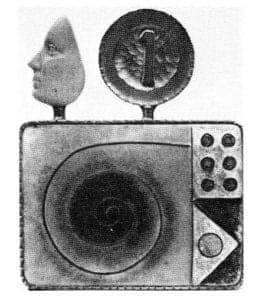 The most outstanding works in the show were the enamel brooches of Elizabeth Garrison. Garrison's work seems to constantly change and grow. She is not afraid to abandon a style that has been fully explored and move on to something new. She is neither limited nor overwhelmed by her technical virtuosity. This current series of small brooches and a bracelet combined cloisonné enamel forms in radiant colors with found objects. Although some combined so many elements as to become confusing both in imagery and form, her simpler pieces were impressive works of art. In her most successful Brooch she juxtaposed the profile of a person and the number one above a shimmering enamel rectangle divided into three sections. The overall balance of form, imagery and color in Garrison's design resulted in a remarkable piece of jewelry, one that was easily wearable yet contained a significant artistic statement.
