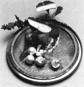 Through experimentation he has also evolved a method of enameling on aluminum which he characterizes as very spontaneous. His most accomplished piece Primordial Transformation (Open-Face Jewelry Box) is a small landscape. On a lazy-Susan-style base he created a background of slumped aluminum with a glittering enamel surface. On this surface were placed two neckbands in concentric configuration and a mummified baby snapping turtle. Within the neckbands were the highlight of the piece, six superb sterling silver eggs, each with a lustrous pearl-like finish. Whole, perfect eggs rested next to broken eggs seemingly left behind by newly hatched turtles.