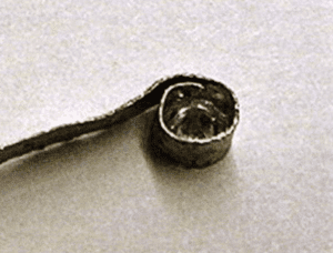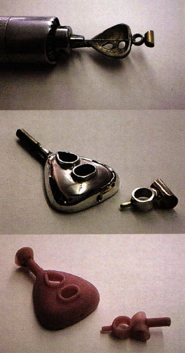 Never cast a big heavy piece ofjewelry with a small delicate piece ofjewelry. The heavier pieces will win that battle every time. The bail, which is much smaller than the main body, did not fill completely. I knew when I tried to do this I was risking a casting failure, but I didn't think it would really happen to me. Good thing it wasn't someone's 25th anniversary present that was due in 2 hours. The main body cast fine. I injected three more tops and sprued and cast them by themselves and they came out fine. From now on, I know to cast all of the main bodies in one flask, and all ofthe tops in another one. You can do multiple pieces in one flask, just not pieces that are drastically different in size and weight.