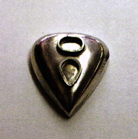 The main body of the pendant is shaped like a guitar pick, with a curved top, and a hollow back. It seems like as good place as any to start. I spend about 3 hours carving this wax pattern, paying close attention to the curvature of the top. The finished wax shown here is ready for casting. This is as far as I'm going to go in wax. I feel that the remainder of the piece would be easier to accomplish using metal fabrication.