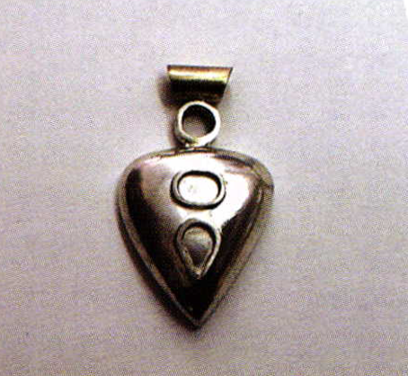 We now need to make a rubber mold in order to make duplicates of this piece. Remember that everything we are doing here is in preparation for making hundreds, or if we're lucky, thousands ofpieces for sale. Now that I have the original assembled, I have to figure out how to sprue the piece. The sprue is the passageway for the wax to exit the mold, and the metal to enter. I decide on a two-part sprue for this pendant. I don't feel that wax or metal entering the large body of the pendant will be able to reduce flow through the 5mm top bezel, and then resume flow and fill the bail on the top. It's just too many different flow rates. So to compensate for this I added a secondary sprue to bypass the body and fill the top bezel and the bail. You can see that the main sprue enters the pendant at the bottom and should fill the main body. The bypass goes directly to the round bezel and bail at the top. I still don't know if this is going to work, but the only way to find out is to just make the rubbermold and see. If it doesn't work, I'll try something else. Stacey really wants this piece to look just like this, and it's my job to see that her dreams come true.