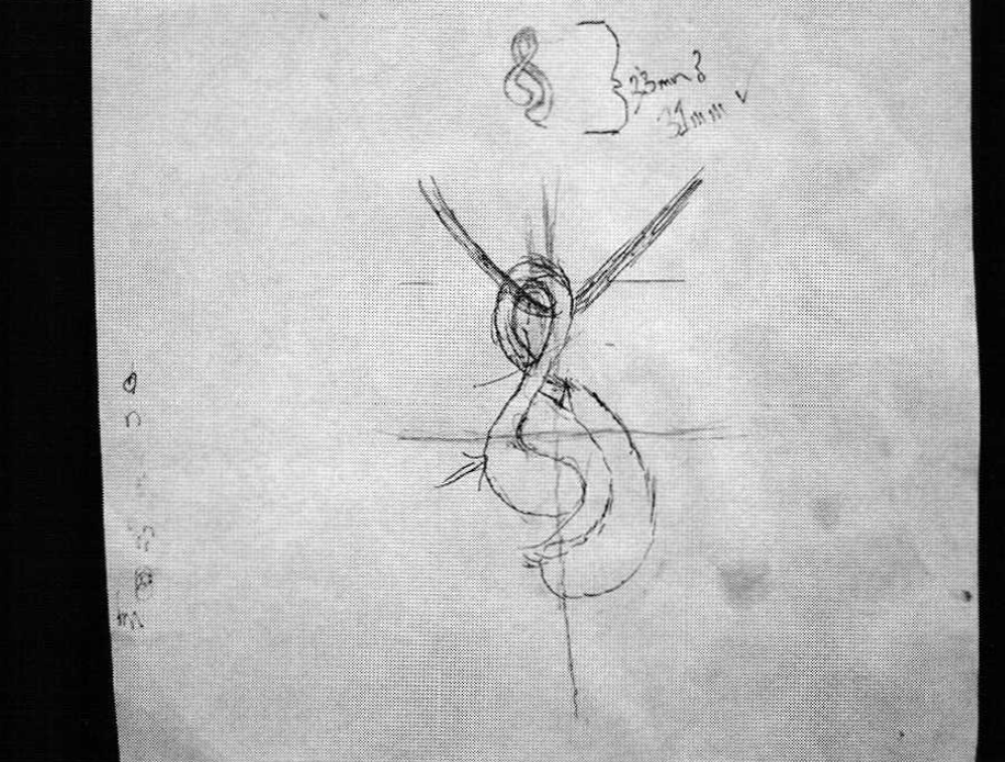 Let's start with the sketch. This is how almost every piece we produce begins. A couple of features I notice immediately about the sketch is that it will contain a faceted center stone, two faceted side stones, and a sphere dangling from the bottom. We decide to bezel set the center stone, and gypsy set (also called flush set) the two side stones.