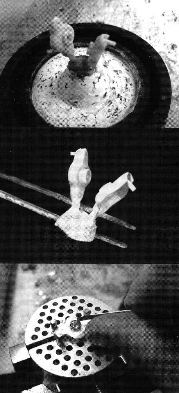 This photo shows the two waxes sprued and ready to cast. The next photo shows the actual casting. Everything came out just fine, there were no surprises in the casting, so I'm ready to clean, polish, and set.