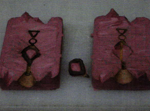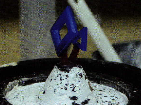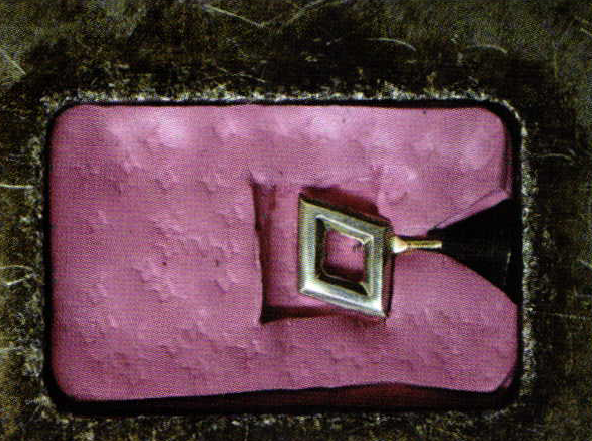 I place the first three pieces of rubber in the mold and pack each one down securely with the prong pusher. I've never counted (until now) how many times I punch the rubber between layers. I discover I'm averaging about seventy punches with each layer to firmly adhere it to the layer below it. In the photo that shows the pendant lying within the void I created, you can clearly see the indentations that the prong pusher leaves and the number of times I punched the mold. Now, the pieces that were removed to create the void come into play. I place the pieces, one at a time, around the piece and punch them very carefully around the piece. What I'm trying to do is fill every void with as much rubber as I can. I end up using all of the pieces I cut out. The photo shows the end result.