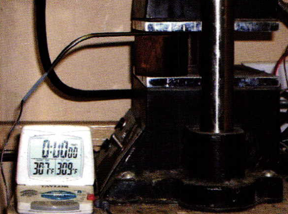Place a block of wood between the plates and insert your temperature probe between the plate and the wood. Now, make small adjustments to the thermostat until you get the desired temperature. Remember that the temperature changes slowly, so begin this process well in advance of starting your mold. There are usually wild temperature swings from the plate to the temperature dial, so don't trust the dial. You are only concerned with the area where the plate meets the mold. Ifyou have a single control vulcanizer, adjust your temperature so that the hottest plate doesn't go over 310 degrees. Once again, there can be wild fluctuations between the two plates, so only concern yourself with the hottest plate.