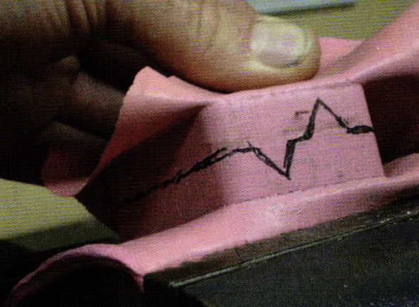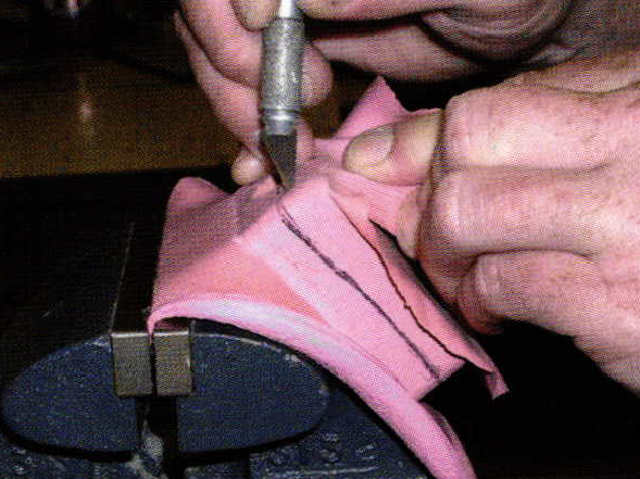 If I have the luxury of time, once the seventy minute timer goes off, I turn off my machine and leave the mold in place overnight at full Pressure to keep the mold from warping. If I don't have the time, I release the pressure and place the mold and mold plates in a vise for an hour or so to cool before cutting. If you have to cut your mold immediately, and notice the edges curling, place a heavy book on the mold overnight and that usually cures the problem. I've taken a sharpie and drawn a line around the mold where I want my initial cuts to be. I use a "Y" shaped mold lock on the top and bottom of the mold. This is done primarily to help align the mold during injection. I begin with about a 2 mm deep cut all around the perimeter of the mold to establish center and mold lock positions. While I'm cutting the mold, notice the position of my fingers in relation to the business side of the X-acto blade. There is never a reason to cut a mold with the blade aimed at your hands and fingers. Think safety first! It's a little awkward at first getting used to cutting away from yourself, but with a little practice, it is second nature. I always cut the bottom of the mold first for a very specific reason. It's the easiest, and it kind of gets me into the mold cutting mind set before I have to do the tricky cutting around the piece. The photo shows the locks are cut, and look closely at the 2 mm deep cut around the edges. This gives you an aiming point at the edge of the mold to keep on center. Once cut open, the mold is ready to inject.