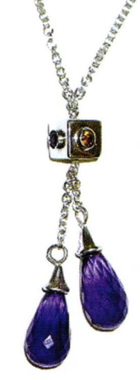 The photo shows the finished pendant with the purple amethyst briolettes. I bought some simple briolette caps, added a very short section of chain, and glued the stones in the cap. Then I soldered the jump rings, and I was finished. The only problem is I hate the piece. For photographic purposes, the piece looks fine, but it doesn't work. After final polishing, I could never get the rouge and tripoli from behind the stones. I wasn't happy with the stone setting, and I wasn't really happy with the casting procedure either. So, what next?