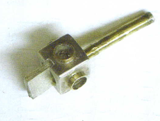 Now, to hold the piece during stone setting, I developed a type of tongue and groove, or keyway system. First, I cut two grooves into the bottom of the pendant to receive a key. Then I make a rectangular piece of stock, the key, to fit the groove. Notice how the key inserts about 2mm into the bottom of the pendant, with about 10mm left exposed below the pendant. I now have a nice heavy holder cast into the pendant that I can clamp into a hand vise, making stone setting a breeze.