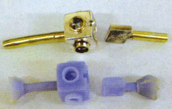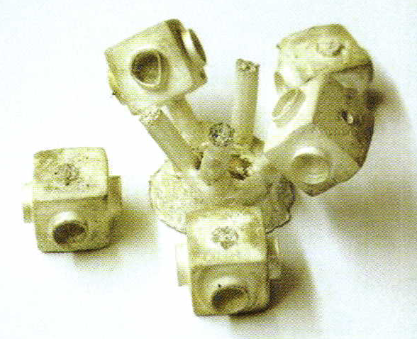 I have to mold my new idea in two pieces, yet I can cast it as one. I can marry the two elements in the wax. The reasoning is that there is big difference between removing a wax from a rubber mold, and removing a metal casting from investment. With a metal casting encased in investment, you can break the mold open and dissolve the material away from the casting. With a rubber mold and wax pieces, the parts are far too delicate. The photo shows the two elements in the original metal model, and then also in their wax counterparts. I can now join the two elements together in wax and cast them as one unit.