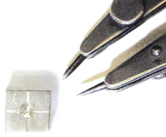 As of right now, I don't have a clue how I'm going to make this pendant work, but I know I have to carve a square block. Stacey decides on a 9mm square. You can see that the wax carving came out pretty square. Ispent about 4 hours carving the wax and trying to keep a good center line on all 6 sides. Once finished with thecarving, I use a round bur and put some indentations in the center of all 6 sides so I could erase my centering lines yet still find center once the piece is cast.