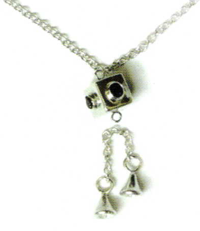 After spending hours of contemplation and endless conversations about how to make a lariat slide, I came up with the solution. It's going to be an "Illusion Slide". It is not going to slide at all. it's just going to look like it does. The photo shows how I soldered a jump ring to the top and bottom of the cube. The next photo shows how the chain slips over the jump rings and appears as if it's passing through the pendant. When, in fact, the upper chain and the lower chain are not connected at all. Pretty clever, huh?