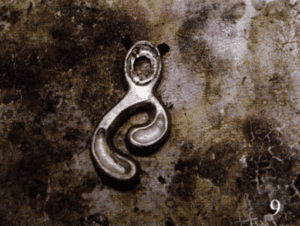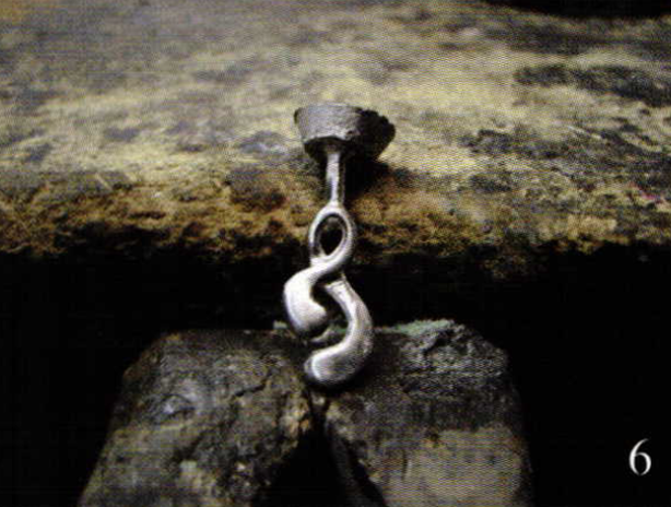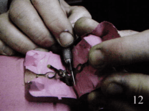 Photo 9 shows the plugs I installed in the holes that were drilled for the chain. The plugs are brass; the original piece is sterling silver.