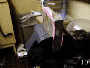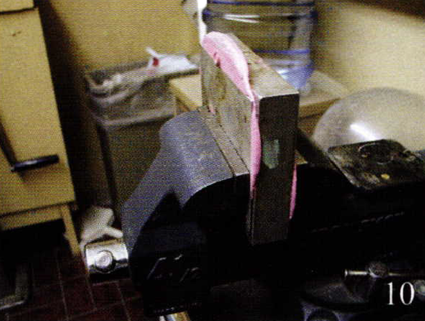 When my timer goes off, I take the mold out of the vulcanizer and place it in a large vice and clamp down, photo 10. The reason is to allow it to cool while still keeping firm pressure on the mold.