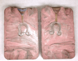 To introduce wax into the cavity of a rubber mold, you have to displace the air in the mold. In order to give the air an escape route, I use talcum powder on both halves of the mold. The photo shows the amount of powder Ishake onto the mold. Next, I clap the two halves together 3-4 times to remove the excess and to even thedistribution of the powder. Talcum or cornstarch powder creates just enough of a separation between the two halves of the mold to allow the air to escape, without affecting the wax pattern.
