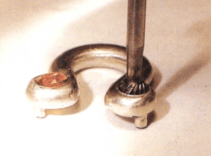 The casting and clean up went just as expected, so we are ready to set the stones. As there are two stones in each pendant, we need to set a total of 8 gemstones. The style of setting that Stacey has decided upon is called Gypsy Setting or Flush Setting. All of the stones are exactly 4 mm in Diameter. Instead of using a traditional stone setting bur to cut the seat. I use a round bur.