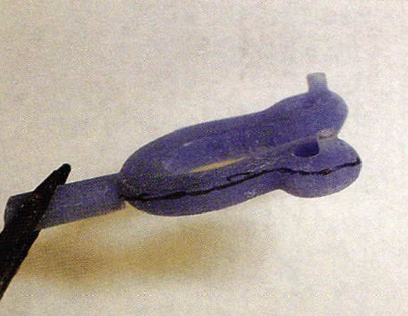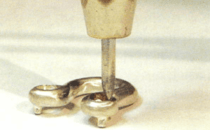 Stacey and I always like to come up with new, innovative ways to suspend a pendant from a chain, and we have decided on a rivet method for this pendant. Mostly, what we try to accomplish is for the clasp to remain at the back of the neck, and the pendant to hang straight. In the photo, look at the pin that protrudes out of theback of the pendant. We decided, since we were going to be using around link chain, to usea rivet. On the left side of the photo you can see the pin that was installed on the original mode. On the right side of the photo, you can see where I slipped the chain link over the rivet and flared and burnished it over the link. Using this method, we feel confident that the pendant will hang properly, and the clasp will always be at the back of the neck. After viewing the first rivet procedure, Stacey was very happy with our invention.