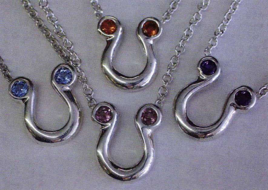 I set a Blue Topaz, a Mexican Fire Opal, an Amethyst, and a Pink Tourmaline for the first run. After setting the stones and riveting the chains, all I needed to do was just a quick clean up and polish. They came out very nice. Stacey is thrilled, once again, by seeing her idea become a new piece in our line. The Steeplechase crowd heard about the new pendant, and bought these four within a week. We've since made and sold another dozen. I guess it's a success.
