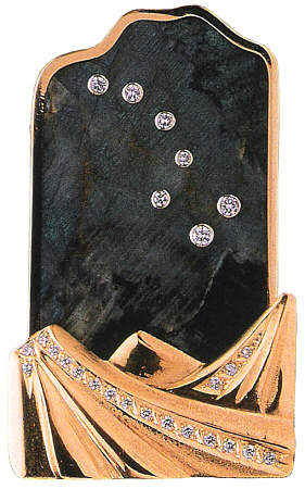 | Starry Night Brooch/Pendant, 1993 18k gold, labradorite, diamonds 2 3/8 x 1 1/2″ Photo: Diamond Information Centre |