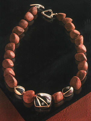 Oceana is the most striking piece of the series, pared down in both color and form. Round and wonderfully nubbly off-white beads from the Philippines form a necklace that culminates in a oval-shaped piece of lava from Hawaii, from which a small cube of lapis lazuli and a pebble from Costa Rica are suspended, skewered by an 14k gold rod. Inlay is sparingly applied, with a tiny opal in the center pebble, a miniscule gold sphere in the lapis cube, and a four-sided pyramid inlay of opal, labradorite, chrysocolla, and bloodstone in the bottom pebble. Despite its apparent simplicity, Oceana was technically demanding. As Stuart points out, "There's no magic way of cutting a square in a stone — I just hacked away at it with my diamond drill and a flex shaft." Making a circle would have been less work, but Stuart doesn't cut corners when it comes to the integrity of his designs.