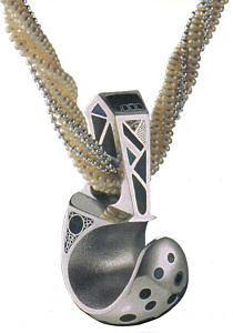 The travelogue vein pursued in Entre Amis reappears in the necklaces Lei Palaoa, Filipina, Oceana, and Sea to Sea to Sea, all created in 2003. Lei Palaoa combines geographical references and sculptural form with inlays that occupy the object's surface in a new way. The unusual form, somewhat like a fishhook, was inspired by a traditional type of Hawaiian regal ornamentation seen by Stuart when he was a visiting professor at the University of Hawaii. The curved bottom of the cast silver form is dotted with circular inlays, more spaciously and irregularly arranged than his usually tightly knit compositions. On the form's side, a breathtaking section of inlay featuring an intricate pattern of circles echoes the small spheres on the bottom. The inlays on the upper stem are more densely applied, with triangles, rectangles, tube sections, and teardrop shapes fitted together, mosaic fashion. The palette speaks of the sea and the tropics, with shades of blue and green predominating. Chains of seed pearls and silver beads marry the natural and constructed aspects of the piece. Like much of Stuart's jewelry, Lei Palaoa combines beauty with a weighty feel this is a piece that could be worn by either sex.