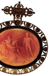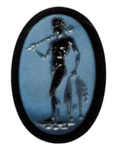 The use of gun drills and wheel technology soon enabled the processing of harder gemstones such as ruby, sapphire or quartz and enabled the production of more demanding images. Two thousand years BC was a golden age in this respect. The rather stylized portrayals of heroes fighting animals, frightful gods and sacrificing people up until then became more realistic. When gemstone engraving was then absorbed into Minoic-Mycenaean and later on in the Hellenic culture, new wind was breathed into this old oriental tradition. The artistically designed plants and animals exude joie de vivre and naturalness. The absolutely refined, miniature figures reflect the Greek ideal image of mankind. Aphrodite and Eros or the Goddess of Victory Nike are found as favorite motifs of the engravers of this age along with the graceful depiction of the female form.