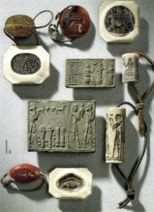 The roots of glyptics are found in the 7th millennium BC. The Babylonians initially used soft stones such as serpentine, steatite, lapis lazuli or turquoise, as naxium, a corundum material from the Island of Naxos can be used to make markings in it. Bearing signs and symbols, the stones soon became popular amulets. Babylonians soon developed the cylindrical form, which soon produced the rolling stamp, which was used to document events of considerable significance. According to a report by Herodot, every Babylonian wore a signet ring or a rolling stamp around their necks. Indeed, many of them have been preserved. The Anthropological Museum in Berlin contains mummies with signet rings still on their fingers. These rings with their symbols cut deep into the stones have been used as stamps for documents and to mark possessions right up into modern times. Their impression made documents legally binding and upheld ownership.