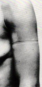 In 1973 Bakker designed the so-called "organic" pieces, which marked on advanced dematerialization of jewelry. With the aid of photographs he showed the impression of a gold-wire which had been tightly bound around arm, leg or waist for a short period. He strove to transfer the accent from the jewel itself to the body. These pieces are literally 'molded to the body': jewelry which, through a minor modification, brings about a startling transformation in the body itself. Bakker's comments on the jeweler's craft are ironic: he used gold at a time when it was practically taboo for the majority of young Dutch jewelers, as a goldsmith he formed not the gold but the body and, finally, the gold wire was kept in a signed, green velvet case.