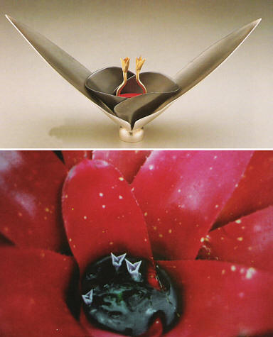 Out of this trip came Amendolara's fascination with the heliconia, an exotic Hawaiian flower that looks rather like a bird of paradise. The showy blooms she favors derive from species originating in the West Indies , where they are also known as wild plantain. Native Hawaiian species are not as flamboyant, but the imported ones have flourished there in the rich volcanic soil and hot, wet climate. The large sturdy plant has a thick stem with boat-shaped modified leaves called bracts, which curve gracefully outward on opposing sides of the stem. Each plant contains a cluster of many bracts that themselves contain the rather inconspicuous flowers. The strong yet graceful curies create a silhouette and sculptural form that are irresistible for an artist; they can be reproduced as is or altered and abstracted. And the image of the vulnerable flowers nestling in the protective sweep of the leaf is echoed throughout the animal world as Neil. Amendolara adapts this image by creating metal forms, usually in sterling silver, which "surround and shelter small beautiful objects usually made of stone or other contrasting material." [5]