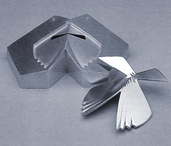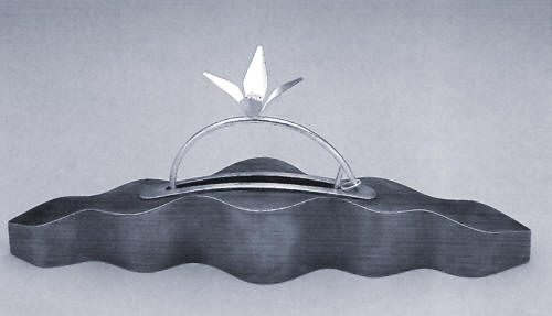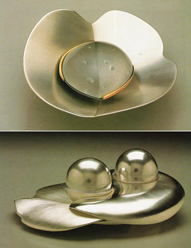 Another interpretation of the origin of ornamentum has to do with grace, an association appropriate to the work of Sue Amendolara. [2] For fifteen years, Amendolara's vessels, holloware, and functional objects have fanned their leaves in satiny silver. And while the narrative content has changed somewhat in recent years, the billowing and pointed forms of her objects have not. [3] Like other classically trained silversmiths — Linda Threadgill comes to mind — Amendolara confidently builds clean forms out of sheet metal. A shot of color, often in imitation coral, may be all that enlivens the white, black, and gold leaves that swoop and soar in three dimensions.