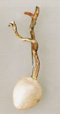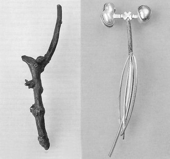 | Bronze Twig, 2000 bronze height 3 1/2″ | Balance. 2001 sterling silver 18k gold, pearls height 3″ Photo: Isaac Applebaum |