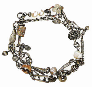 Jones's bracelets occupy a particular space in her artistic world, acting as allusions to the jumbled state of our unconscious minds. Melange, a bracelet/necklace of sterling silver, 14 karat gold, bronze, copper, and pearls, is a delightful hodgepodge that combines discs, rings, and bands of assorted sizes with abstract and organic shapes reminiscent of found objects and vegetal debris dug up from the garden. "They're emblematic of that clutter of memory that we have-nonspecific feelings, and bits of things," says the artist, who staunchly defends our right to cherish that which is magical and unexplained.