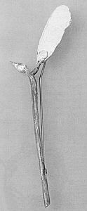 Finding a way to keep things interesting, both for herself and for her audience, is a challenge that Jones maintains is essential. Having to prepare work for an exhibition is one route to this end. In her last solo outing, "Memory: Recent Work," in the fall of 2000, the unexpected came by way of a series of bronze and sterling twig pins, so lifelike as to be almost indistinguishable from the real thing. "I've wanted to make twigs for a while," she .says. "They're detailed copies I've made in wax, then bad cast. That to me has integrity, in a way that casting directly from a twig doesn't." The series was prompted by our innate desire to preserve the ephemeral beauty of found natural objects and the feeling of connection to the earth they awaken within us. As Jones points out, simply removing such objects from their environment and sitting them on a shelf doesn't always work. "You bring it home, and it doesn't feel right." There is also the issue of permanence. Unlike metal, jewelry made from seedpods will eventually disintegrate.