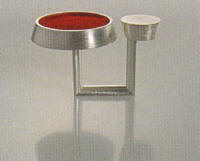 The finely cut, organic forms of the armlets, earrings and rings by Ulrike Hamm seem alive, as if they were moving to and fro in imaginary water. The material is light as a feather, soft as satin, and yet stable. Hard to believe that these delicate jewelry objects are made of skin, or more precisely, of vellum. The designer cuts the naturally ivory-colored alfskin while it is dry and then colors it with pigments. A mortise-and-tenon jointure connects the wet pieces, which are then transformed into "floral" forms while they dry. Hamm combines some of her jewelry projects with oxidized silver. The resonance of the blackened silver with the pellucid vellum objects focuses the viewer's attention entirely on the airy, nuanced play of colors.