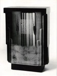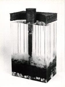 The metal parts are electroformed copper with a very nodular coarse texture that does nor invite touching. You would not want to put the wine cup to your lips. The forms are minimal, geometric, cold and forbidding. The color of the metal is rusty, and since three of the forms resemble tin cans, the combination of form, texture and color speaks of decay and disintegration. The contrast with the pristine, precise purity of the clear plastic augments the quality of each. The three stacked cylinders fit into a hole in the acrylic block. The first image that came to mind was of the radioactive fuel rods suspended in the water of a nuclear reactor. The embedded material at the bottom of the block has two layers. The top appears to be the same light-colored foamy substance Lechtzin used in his Mezuzah. The lower layer is darker and as it approaches the bottom of the block, it turns to a funereal black. My immediate reaction to the light foam was that it suggested illness: it resembled used surgical cotton piled in the bottom of a waste can. The black material, which is very granular, echoing the texture of the electroforms, looked like ashes.