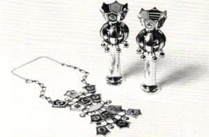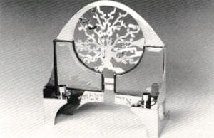 In 1906, with the founding of the Bezalel School of Arts and Crafts in Jerusalem, Palestine became an important center for the craft production of ceremonial art. Early Bezalel designs appear to derive from the Middle Eastern style, European decorative arts and hints of Art Nouveau, Art Deco and a noticeable helping of what looks like the public school manual-raining class style of the 1930s and 1940s in America. This is not surprising since Palestine was, as Israel is now, a mosaic of many cultural influences. With the high-speed absorption of refugees from pre-war Germany and post-war Europe in the 30s and 40s, the esthetic balance shifted to a modernist style, which Israeli metalsmiths continue to favor.