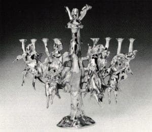 The symbolism is apt but the column still lacks grace. Distributed in front of the arms of the candelabrum, obscuring much of it, and apparently dangling in space, is a group of modern "angels" with skirts flapping, like middle-aged matrons doing a frantic imitation of Mary Poppins. The branches have sockets for candies, so the piece is functional, yet there is a "neither-fish-nor-fowl" quality about it. It wants to be a functional ritual object but it doesn't want to relinquish the undeniable status that goes with the territory owned by sculpture. The use of figurative imagery, either flat, in relief or in the round is very common in traditional Jewish ceremonial objects, in spite of the Second Commandment's proscription against the making of graven images.
