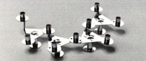 Janet Dash's articulated Hanukah lamp, consisting of four horizontally linked triangles, is a clever and attractive addition to the family of ceremonial objects including those that fold up for traveling and the do-it-yourself design, which one can alter by rearranging the parts. To chop up thin metal sheet on a squaring shear like paper and to cut off lengths of off-the-shelf metal tubing like sausage, and to solder it together, is to abdicate responsibility for the design.