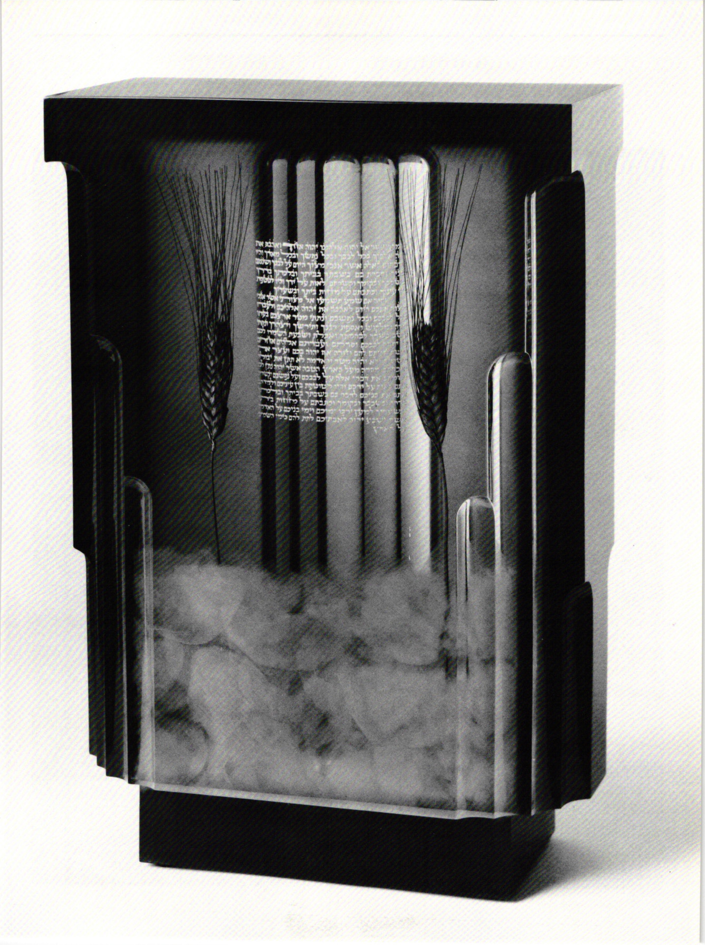 Stanley Lechtzin's cast acrylic Mezuzah typifies some important aspects of his style: the intense exploration and adaptation of modern industrial processes and materials, the impulse to innovate, technically and esthetically, to constantly stretch the boundaries imposed by convention, to execute work with skill that exceeds human expectations. So, it is not a surprise that the Mezuzah is a bravura statement. The piece is essentially a violet rectangular block of acrylic 15½"h by 10⅜"w by 4⅜"d. It rests on a low, slightly smaller base, has a flat top and vertically oriented flutes that have been milled into the corners and the back surface. The fluting is intended to suggest a column, which, in turn, relates to a door post. The word Mezuzah means "doorpost." There are embedments in the cast acrylic: the Hebrew passage from the Bible in white calligraphy, two stalks of wheat bordering the inscription and what appears to be light-colored plastic foam filling the bottom third of the block.